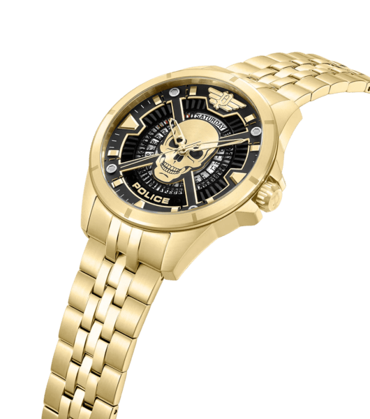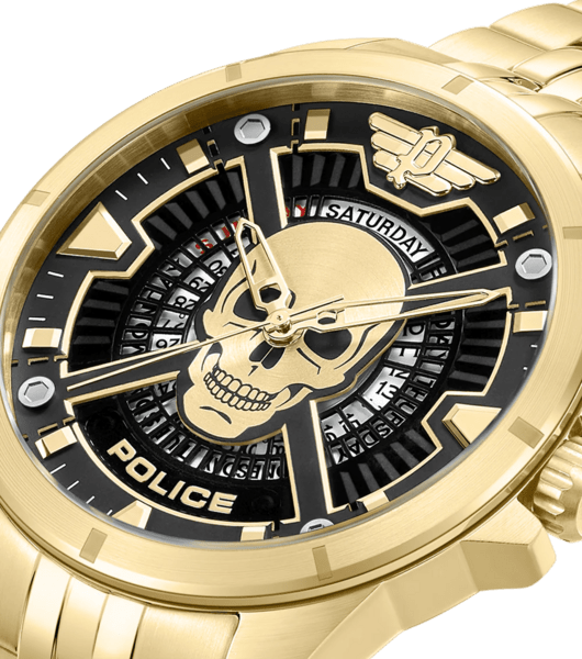 Zegarek Police PEWJH0005403 ma okrągłą tarczę w kolorze czarnym, na której wyróżniają się złote wskazówki i indeksy. Tarcza jest chroniona przez mineralne szkło, odporne na zarysowania i uszkodzenia. Dzięki dwupoziomowej powierzchni tarczy, datownik dnia tygodnia i miesiąca został zgrabnie schowany pod strukturą cyferblatu.