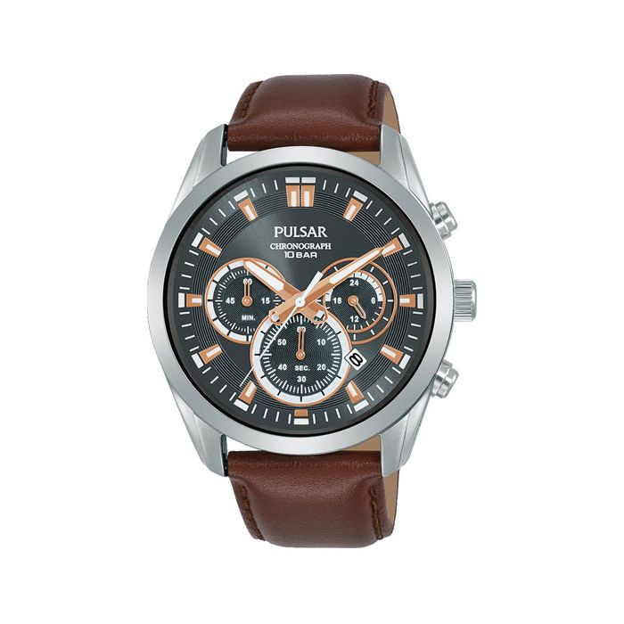 Pulsar PU PT3A97X1 to sportowy chronograf, przeznaczony dla mężczyzn prowadzących aktywny tryb życia. Zegarek ten posiada bardzo dokładny mechanizm kwarcowy ze stoperem i datownikiem wskazującym dzień miesiąca oraz wskazanie czasu w trybie 24h. Koperta ze stali nierdzewnej połączona ze skórzanym paskiem dobrze komponuje się kolorystycznie. Osadzono w niej bardzo trwałe szkło mineralne. Tarcza koloru szarego idealnie kontrastuje z oznaczeniami godzin co sprawia, że jest przyjemna dla wzroku i czytelna. Klasa wodoszczelności 100m pozwala na pływanie oraz nurkowanie bez akwalungu. Średnica koperty wynosi 43 mm, grubość 11 mm.