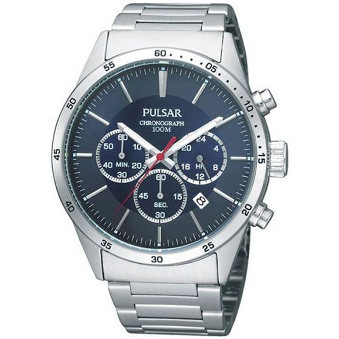 Modny zegarek męski Pulsar PT3003X1 to propozycja dla osób ceniących wysoką jakość idącą w parze z dobrym wyglądem. Masywna koperta o średnicy 43mm została zestawiona z solidną bransoletą ze stali szlachetnej, która jest odporna na korozję. Ciemna granatowa tarcza w połączeniu z metalicznymi wskazówkami i indeksami tworzy przyjemną dla oka całość. Zastosowane w zegarku szkło mineralne charakteryzuje się zwiększoną odpornością na zarysowania. Ten model został wyposażony w praktyczny datownik, wskazujący aktualny dzień miesiąca oraz w chronograf. Wskazanie czasu w trybie 24h ułatwia orientację pory dnia. Precyzyjny mechanizm kwarcowy gwarantuje dokładne wskazania czasu. Wodoszczelność 100M pozwala na swobodne pływanie i nurkowanie bez akwalungu.