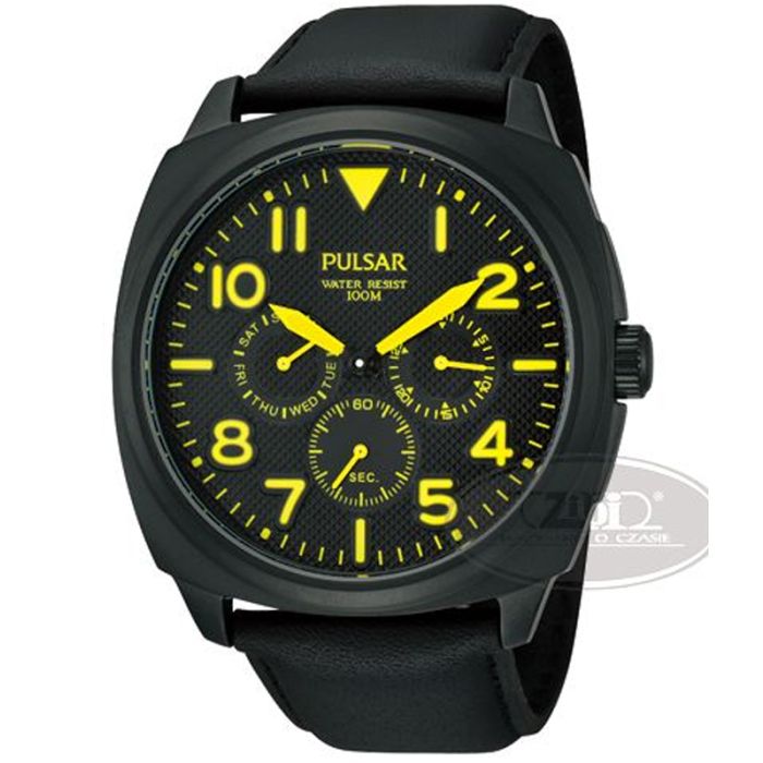 Pulsar PP6077X1 Multidate to nowoczesny klasyk o zacięciu sportowym przeznaczony dla mężczyzn. Zegarek ten posiada bardzo dokładny mechanizm kwarcowy z rozbudowanym datownikiem wskazującym dzień miesiąca oraz nazwę dnia tygodnia. Koperta ze stali nierdzewnej (pokryta czarnym PVD) w połączeniu z gustownym skórzanym paskiem tworzy spójną całość. Osadzono w niej bardzo trwałe szkło mineralne. Tarcza koloru czarnego idealnie kontrastuje z żółtymi oznaczeniami godzin co sprawia, że jest przyjemna dla wzroku, przejrzysta i czytelna. Klasa wodoszczelności 100 M pozwala na pływanie oraz nurkowanie bez akwalungu.