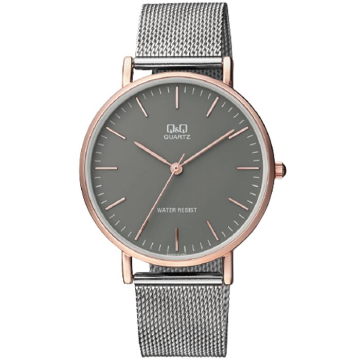 Q&Q Fashion QA20-412 to zegarek uniwersalny, który można nosić zarówno na co dzień jak i na bardziej oficjalne okazje. Srebrno-miedziana kolorystyka czasomierza idealnie komponuje się z delikatną tarczą, która jest oznaczona delikatnymi indeksami co sprawia, że jest przejrzysta i minimalistyczna. Zegarek wyposażony jest w kwarcowy mechanizm zasilany baterią. Koperta została wykonana z trwałego stopu metali i połączona z modną, stalową bransoletą typu Mesh. Klasa wodoszczelności 30M sprawia, że zegarek jest odporny na drobne zachlapania. Marka Q&Q jest częścią koncernu Citizen.