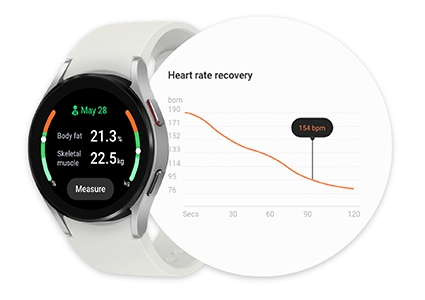 Galaxy Watch4 dokonuje pomiaru tętna powysiłkowego, żeby sprawdzić czy regeneracja odbyła się w odpowiednim tempie.