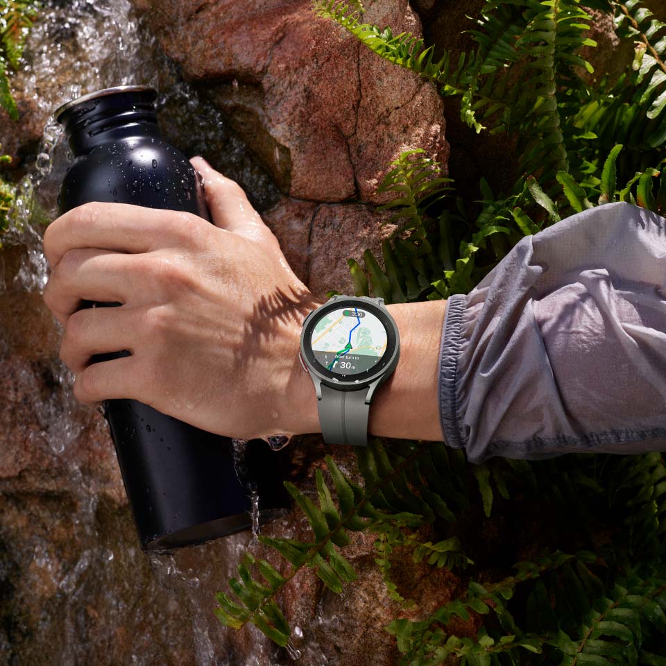 Jeszcze wygodniej trenuj w terenie. Bez względu na to, czy jeździsz na rowerze, biegasz, czy uwielbiasz trekking, zawsze możesz liczyć na Galaxy Watch5 Pro. Zaimportuj trasy w formacie GPX*, by mieć do nich stały dostęp. Podążaj wyznaczoną ścieżką jak po sznurku, dzięki wskazówkom głosowym i alertom w formie wibracji**.