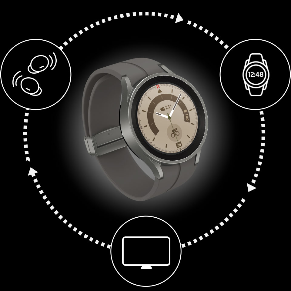 * W przypadku braku łączności LTE i posiadania wersji Galaxy Watch5 Pro Bluetooth, wymagane jest korzystanie z tego samego konta Samsung. Wymagane jest połączenie Wi-Fi i Bluetooth.