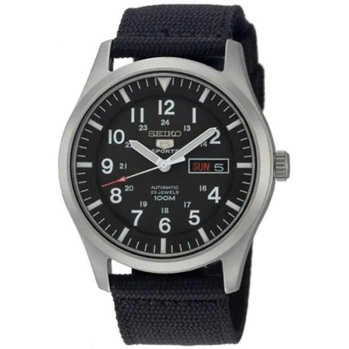 Seiko SNZG15K1 to zegarek męski z kolekcji Seiko 5. Koperta została wykonana z wysokiej jakości stali szlachetnej. Połączono ją z czarnym paskiem materiałowym. Wraz z czarną tarczą tworzą militarny styl. Zegarek napędzany jest niezawodnym mechanizmem automatycznym łożyskowanym na 23 kamieniach z funkcją datownika, który wskazuje dzień tygodnia i miesiąca. Mechanizm automatyczny nie potrzebuje baterii. Wykorzystuje on energię z ruchu ręki do nakręcania mechanizmu. Wodoszczelność 100m pozwala na swobodny kontakt z wodą.