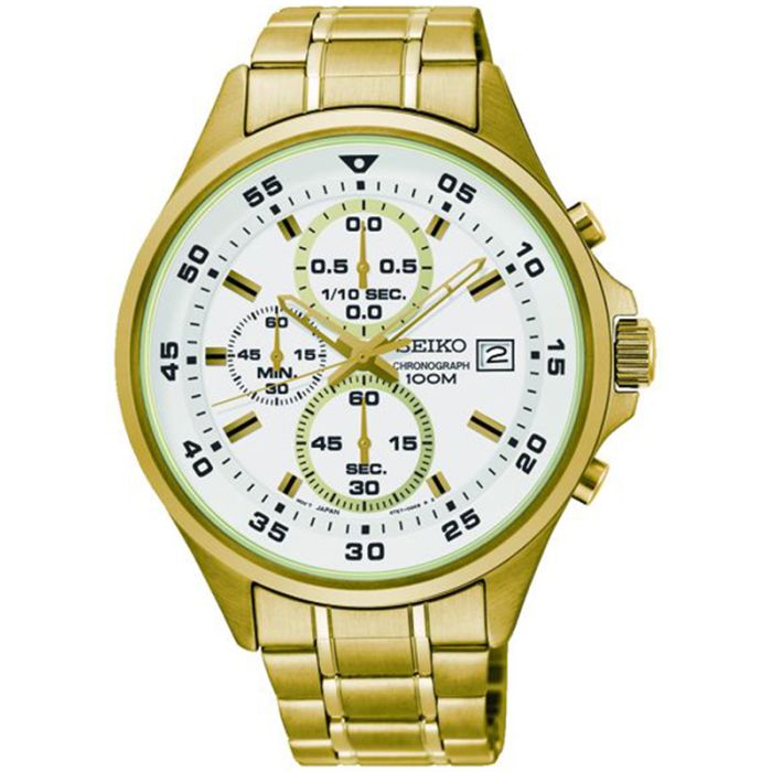 Sportowy zegarek męski Seiko Chronograph SKS632P1 posiada wyróżniającą się stylistykę. Został wyposażony w bardzo dokładny mechanizm kwarcowy ze stoperem i datownikiem wskazującym dzień miesiąca. Koperta została skomponowana z bransoletą zapinaną na bezpieczne, składane zapięcie. Oba elementy zostały wykonane z wysokiej jakości stali szlachetnej odpornej na działanie warunków atmosferycznych. Dodatkowo pokryto je odporną na ścieranie powłoką w kolorze złota. Biały cyferblat został przykryty szkłem typu Hardlex, które jest drugim po szafirowym najbardziej odpornym materiałem na zarysowania używanym w przemyśle zegarmistrzowskim. Wodoszczelność 100M pozwala na swobodne pływanie bez zdejmowania zegarka z ręki.