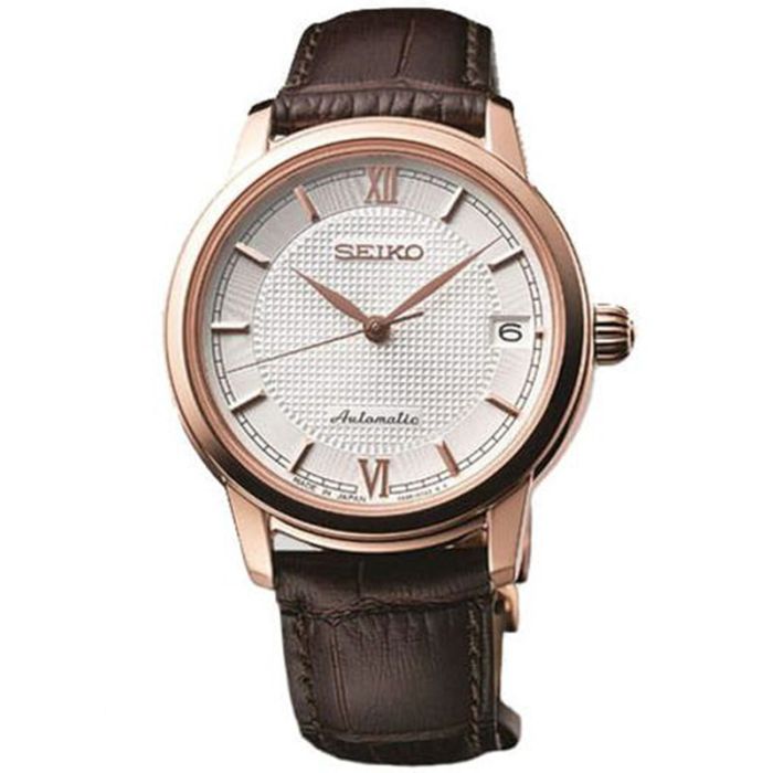 Seiko Presage SRP858J1 to elegancki zegarek damski z mechanizmem automatycznym. Wysoka jakość wykonania tego modelu jest wynikiem doświadczenia i tradycji w tworzeniu wyjątkowych czasomierzy zbieranych przez ponad 100 lat. Stalowa koperta została pokryta powłoką z różowego złota metodą galwaniczną (warstwy złocenia zostały dodatkowo utwardzone), która charakteryzuje się wysoką odpornością na ścieranie. Ozdobna koronka oraz ciekawie wyglądający cyferblat nadaje temu modelowi styl retro. Odporne na zarysowania szkło szafirowe chroni cyferblat. Ten typ szkła pozwoli zachować zawsze schludny wygląd czasomierza. Koperta tego modelu została zawieszona na brązowym pasku z naturalnej skóry cielęcej. Zegarek został wyposażony w mechanizm automatyczny (kaliber 4R35) z technologią trimatic, która zwiększa odporność na przeciążenia, podnosi efektywność działania mechanizmu oraz wydłuża jego żywotność. Rezerwa chodu wynosi 41 godzin. Mechanizm napędza się samoczynnie podczas ruchu ręką niezależnie od kierunku obrotu wahadła. Na tarczy znajduje się również datownik wskazujący dzień miesiąca. Wodoszczelność 100m pozwala na swobodny kontakt z wodą np. podczas pływania.