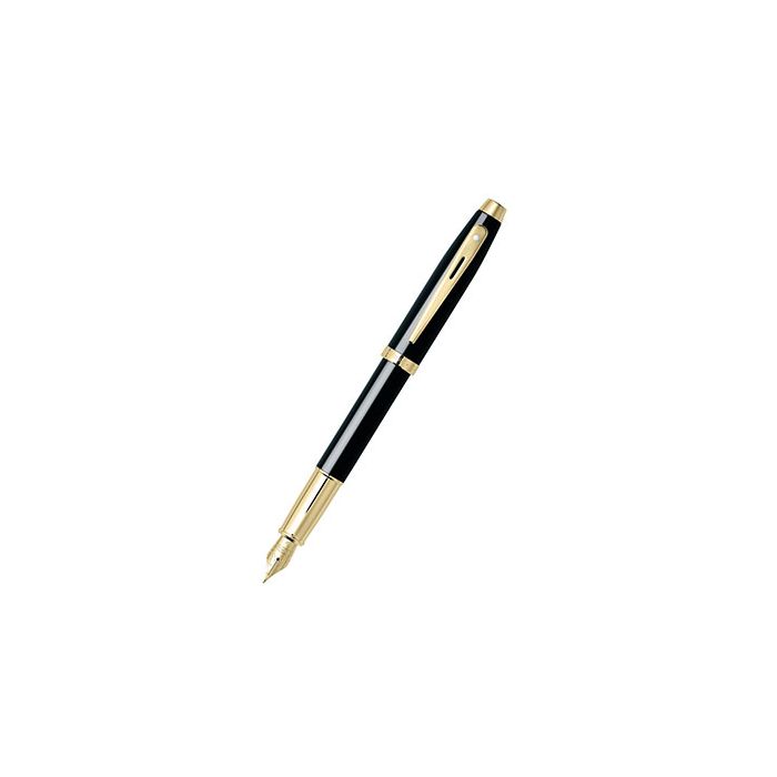 Pióro wieczne Sheaffer 300 Czarny ze złoceniami wykonane jest z metalu i pokryte warstwą czarnego, błyszczącego lakieru. Zdobiona, dwukolorowa stalówka ze stali nierdzewnej. Całość wieńczą złocone wykończenia.