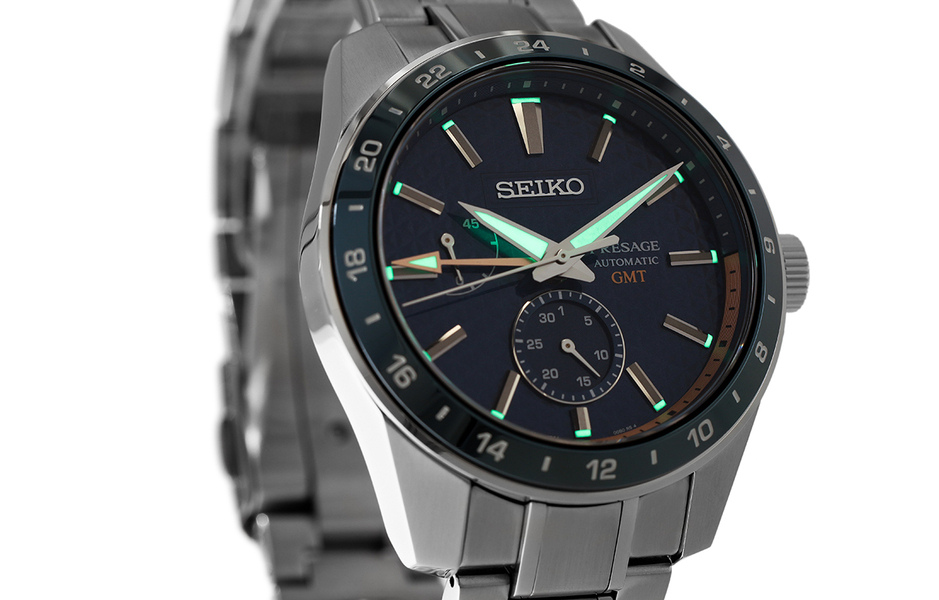 Tarcza modelu Sharp Edged GMT SPB217J1 odwołuje się do ducha tradycji i japońskiej stylistyki. Producent określa jej barwę jako hihada-iro, w nawiązaniu do koloru kory cyprysu japońskiego. Tarcza posiada delikatne tłoczenie we wzorze Asanoha, obecnym w japońskiej kulturze od ponad tysiąca lat. Gra świateł na powierzchni tego przestrzennego deseniu wygląda wyjątkowo intrygująco. Na tarczy znajdziemy wskazówki rezerwy chodu oraz małą giloszowaną tarczę datownika. Dla podniesienia czytelności zegarka jego indeksy wykończono fasetowaniem, a wskazówki wzbogacono warstwą luminescencyjnej farby Lumibrite.