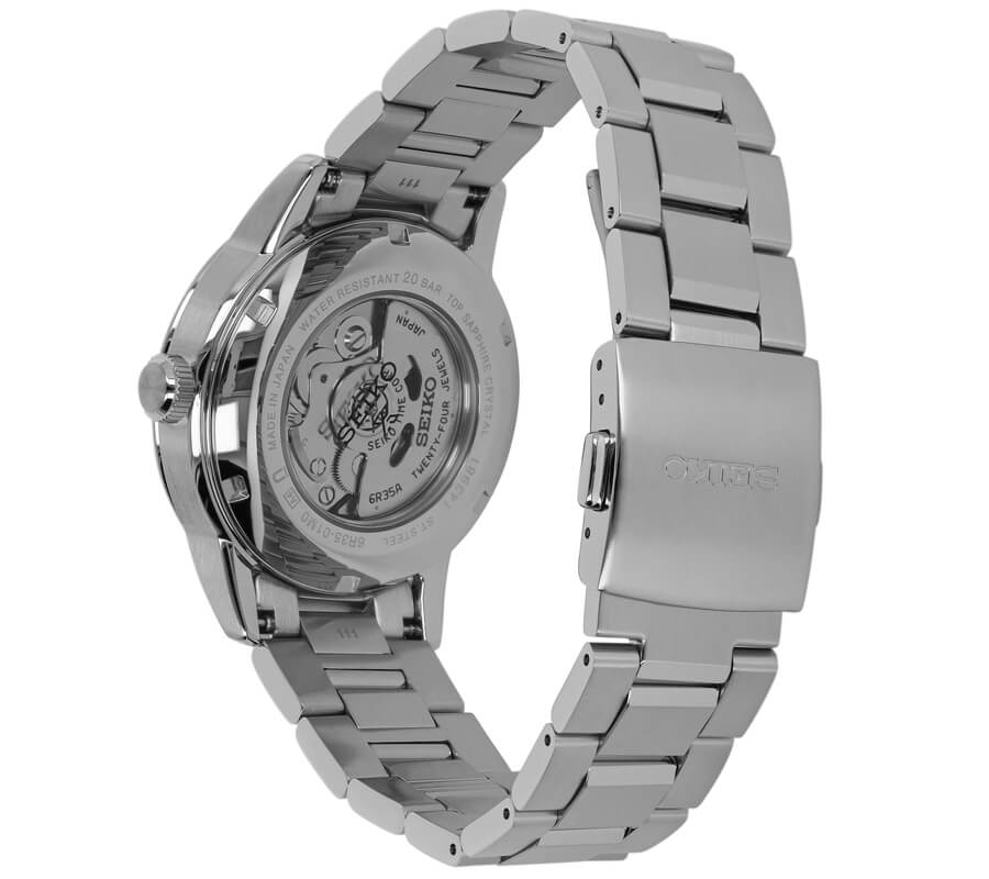 Napędzany mechanizmem automatycznym Seiko 6R35 z 24 kamieniami, ten zegarek oferuje imponującą rezerwę chodu wynoszącą aż 70 godzin, co oznacza, że można cieszyć się jego pracą przez długie okresy bez konieczności częstego nakręcania. Odporność na pole magnetyczne do 4,800 A/m oraz wodoszczelność do 20 bar (200 metrów) sprawiają, że jest to idealny towarzysz dla aktywnych osób, które nie boją się wyzwań.