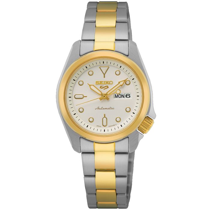 Seiko 5 Sports Automatic Compact SRE004K1 to zegarek damski, który łączy w sobie niezwykłe cechy linii Seiko 5 - automatyczny mechanizm, datownik wskazujący dzień miesiąca i nazwę dnia tygodnia, wysoką wodoodporność, koronkę na godzinie czwartej oraz trwałą bransoletę ze stali szlachetnej. Uniwersalny wygląd w srebrno-złotym kolorze sprawia, że ten model pasuje do różnych okazji i stylizacji. Dzięki precyzyjnemu mechanizmowi Seiko 2R06 i utwardzanemu mineralnemu szkłu, zegarek zachowa swój elegancki wygląd na długi czas. Seiko 5 Sports Automatic Compact SRE004K1 to idealny wybór dla kobiet, które cenią sobie funkcjonalność, precyzję i elegancję w jednym.