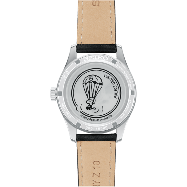 Na jej boku, na wysokości godziny 4, umieszczono równie srebrną, dokręcaną koronkę. Od spodu kopertę zamyka zakręcany dekielek, na który naniesiono komiksowy kadr Snoopy’ego w trakcie lądowania z użyciem spadochronu. Wokół rysunku umieszczono podstawową specyfikację techniczną, włącznie z numerem seryjnym Twojego indywidualnego modelu. Wodoszczelność zegarka wynosi 100m, wytrzyma on zatem pomniejsze zachlapania, kąpiele, czy nawet pływanie powierzchniowe.