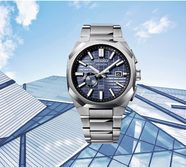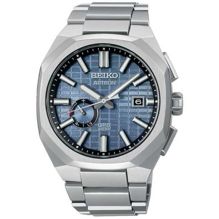 Niebieska tarcza zegarka Seiko Astron SI SSJ013J1 posiada geometryczną strukturę przypominającą kryształy kwarcu. Tarcza ma minimalistyczny projekt, z datownikiem miesiąca na godzinie trzeciej. Subtarcza znajdująca się na godzinie ósmej wskazuje proces odbioru sygnału GPS, oraz tryb samolotowy.