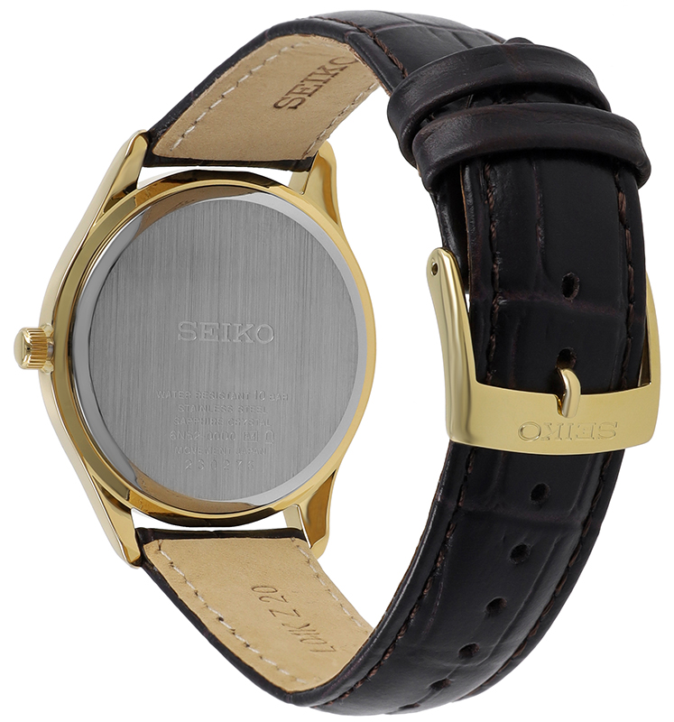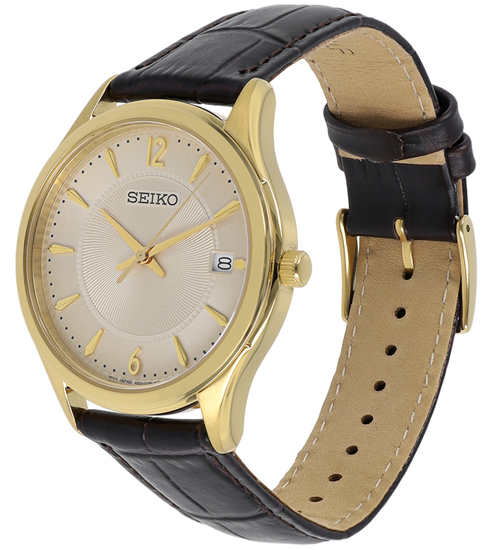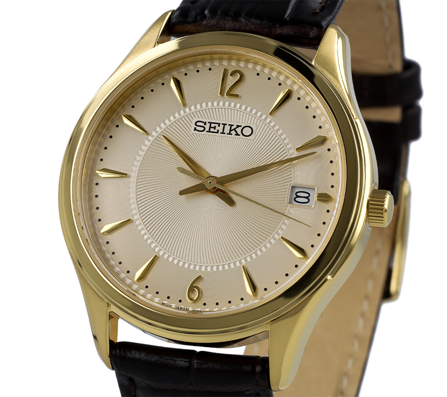 Zegarek Seiko SUR472P1 wyróżnia się złotą tarczą, która nawiązuje do klasyki. Złoty kolor tarczy sprawia, że zegarek prezentuje się luksusowo i elegancko. Tradycyjne, analogowe wskazówki są czytelne i doskonale odzwierciedlają klasyczny charakter tego modelu. Szkiełko szafirowe stanowi ochronę tarczy, zapewniając wysoką odporność na zarysowania i uszkodzenia.