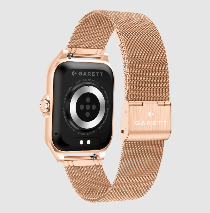 Smartwatch Garett GRC Activity 2 Złoty Matowy to smartwatch z wysokiej jakości materiałów i designem. Jego tarcza jest wykonana z wysokiej odporności na wodę i kurz matowego materiału, który zapewnia komfort noszenia. Zegarek ma elegancki kształt i smukłą obudowę, która pasuje do każdego stylizacji. Możesz go nosić zarówno na co dzień, jak i podczas różnych aktywności sportowych.