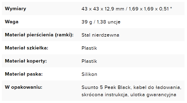 Suunto 5 Peak jest lekki, wygodny, trwały i posiada wytrzymałą baterię — idealna mieszanka dla zegarka sportowego. Pełna bateria pozwoli na pracę zegarka przez 7 dni, uwzględniając codzienną aktywności i śledzenie snu, a podczas intensywnego treningu z wykorzystaniem GPS wystarczy na 3 godziny. Specjalny tryb baterii pozwoli na 100 godzin pracy zegarka podczas wędrówek z opcją GPS. Konstrukcja zegarka jest komfortowa w noszeniu i lekka, ale jednocześnie odporna. Dzięki tym właściwościom Suunto 5 Peak to niezawodny partner Twojej aktywności.