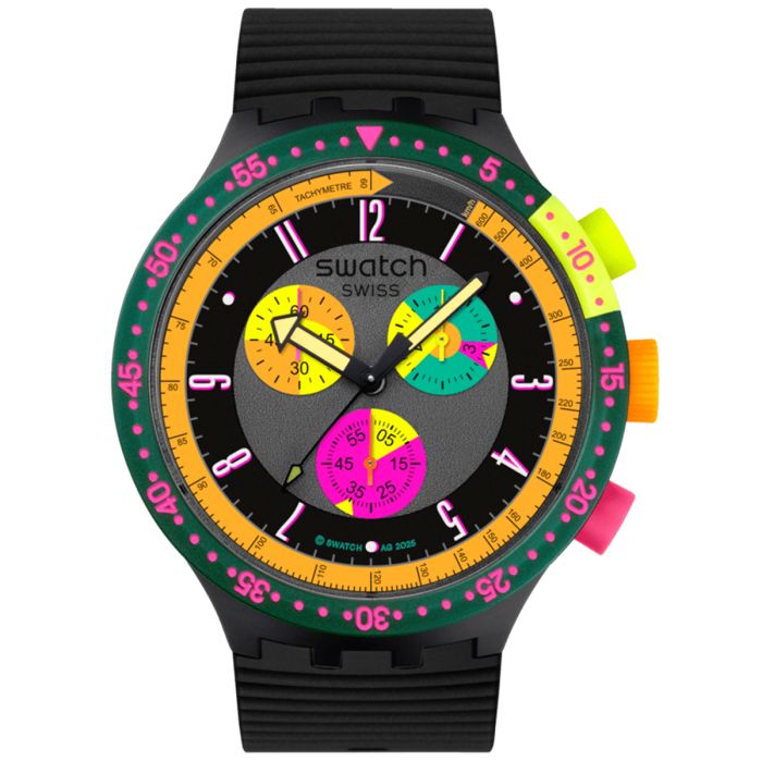 Duża koperta o średnicy 47 mm i kontrastujące neonowe akcenty w różu, zieleni i żółci sprawiają, że zegarek wyróżnia się z tłumu, przyciągając spojrzenia i dodając stylizacji nowoczesnego charakteru.