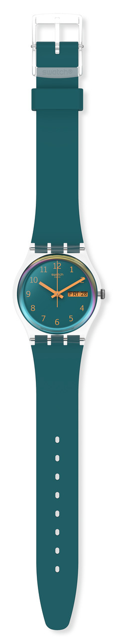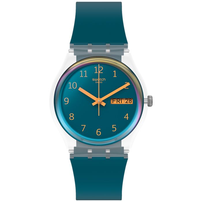 Tarcza zegarka SWATCH Blue Away ma elegancki, niebieski kolor, który w połączeniu z prostym designem tworzy ponadczasowy wygląd. Zastosowane szkło wykonane jest z tworzywa pochodzenia naturalnego, co zapewnia odpowiednią wytrzymałość oraz odporność na codzienne uszkodzenia.
