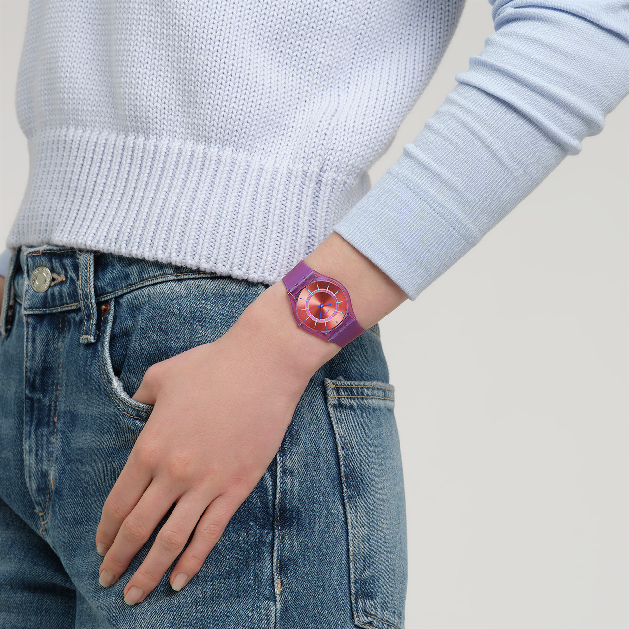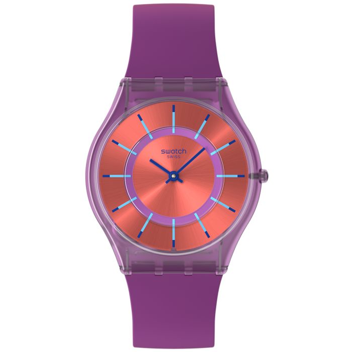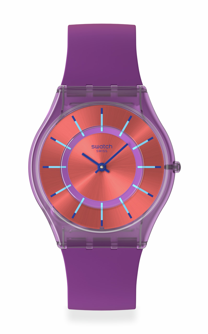 Koperta o średnicy 34 mm i grubości 4,3 mm została wykonana z tworzywa pochodzenia naturalnego, co podkreśla innowacyjny charakter zegarka. Fioletowy pasek z elastycznego silikonu zapewnia komfort noszenia i idealne dopasowanie do nadgarstka.