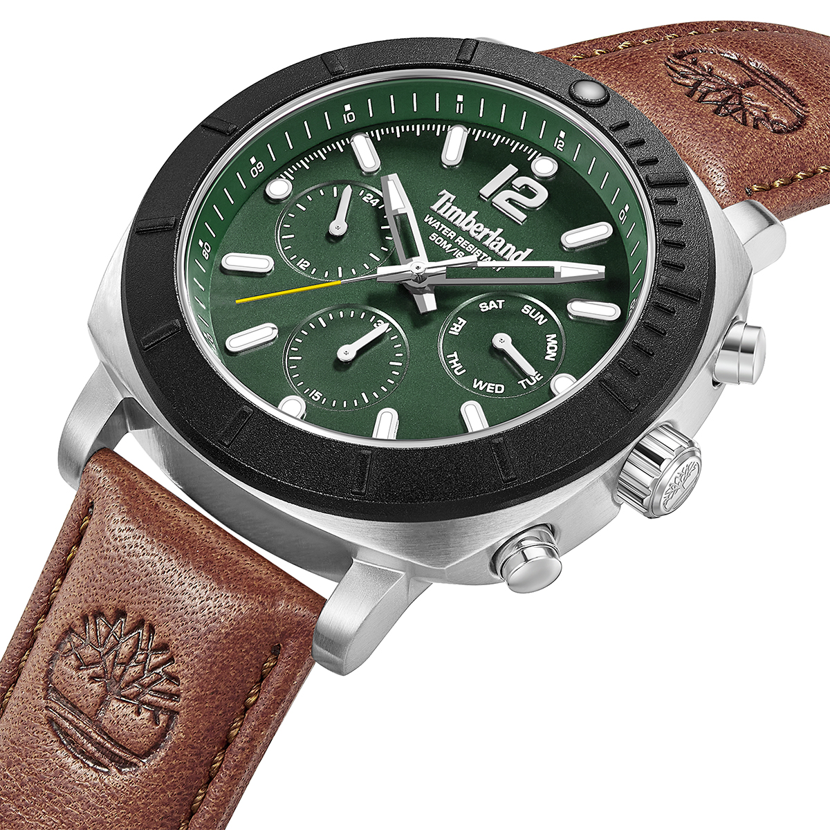 Zegarek posiada solidną kopertę wykonaną ze stali szlachetnej w kolorze srebrnym, o średnicy 46 mm, co nadaje mu wyrazisty i nowoczesny wygląd. Skórzany pasek w odcieniu klasycznego brązu zapewnia wysoki komfort noszenia oraz podkreśla naturalny, outdoorowy styl marki Timberland. Szerokość paska przy kopercie wynosi 24 mm, co dodatkowo wzmacnia jego męski charakter.
