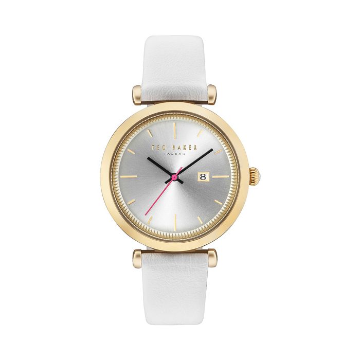 Zegarek damski Ted Baker Ava 10031519 w modnych kolorach złota i bieli. Doskonale nadaje się na specjalne okazje dzięki połączeniu w sobie elegancji i blasku. Stalowa koperta o średnicy 36 mm została połączona z paskiem z naturalnej skóry. Powłoka złota na kopercie została wykonana metodą PVD, która jest wysoce odporna na ścieranie, a stal jest nie ulega korozji. Tarcza typu Sunray z misternie wykonanymi brzegami została zaprojektowana tak aby "łapać światło". Kolejnym ozdobnym elementem jest wykończenie sekundowej wskazówki w malinowym odcieniu. Dokładny czas wskazuje niezawodny mechanizm kwarcowy zasilany baterią. Wodoszczelność klasy 50m pozwala na niewielki kontakt z wodą np. pod prysznicem.