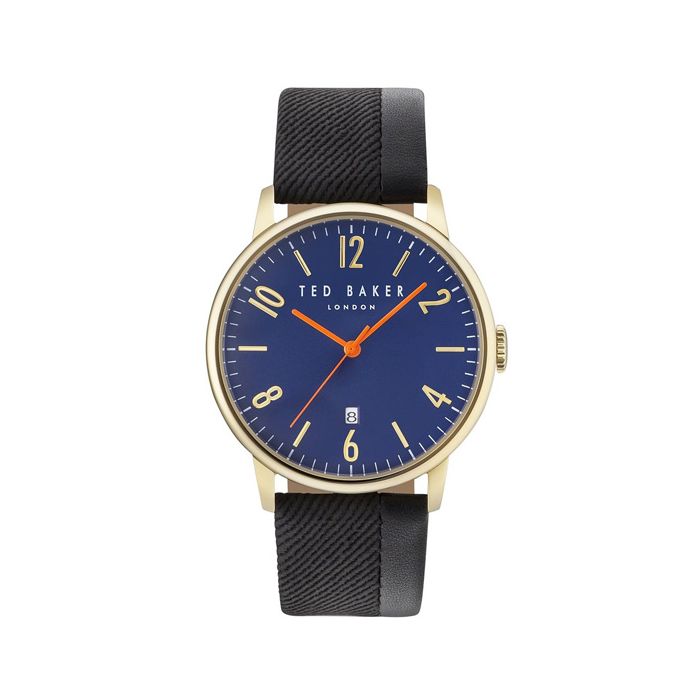 Zegarek Ted Baker Daniel 10031571 znakomicie uzupełni strój każdego mężczyzny, który łączy w sobie prostotę z wyszukanym wyglądem. Koperta o średnicy 42 mm została wykonana z wysokiej jakości stali szlachetnej, która nie ulega korozji i wykończona złoceniem metodą PVD. Kopertę zestawiono z ciekawym w dotyku bawełnianym skosem połączonym ze skórą, co tworzy pasek z mieszanych tworzyw. Na granatowym cyferblacie umieszczono ręcznie cyfry arabskie i indeksy co optycznie wzbogaca kompozycję. Dodatkowo na dole umieszczono datownik wskazujący dzień miesiąca. Wskazówki zaakcentowano pomarańczowym kolorem. Model ten wyposażono w dokładny mechanizm kwarcowy zasilany baterią. Wodoszczelność klasy 50m pozwala na niewielki kontakt z wodą np. pod prysznicem.