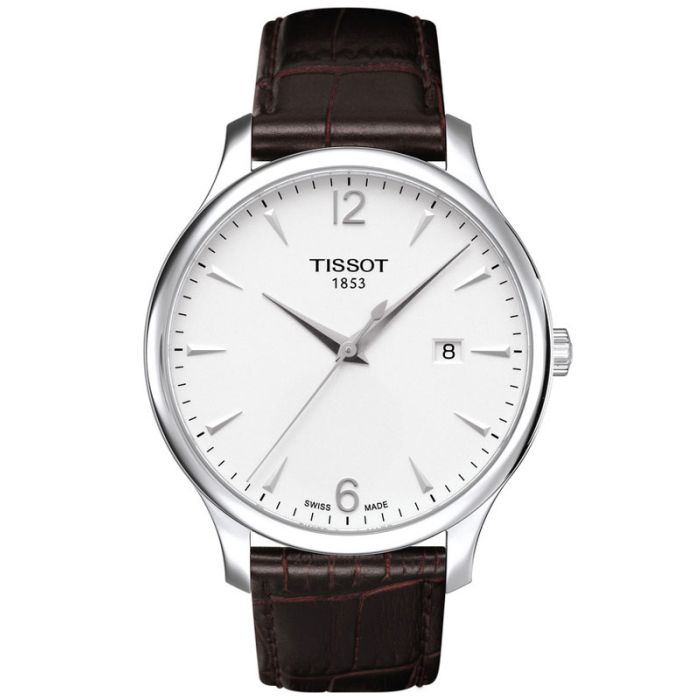 Swój elegancki, a zarazem niebanalny wygląd zegarek zawdzięcza srebrzystej tarczy. Znajdujące się na niej arabskie i symboliczne indeksy oraz wskazówki o tym samym kolorze sprawiają, że model ten odznacza się ponadczasową klasą i nie przestaje zachwycać stylem. W tarczy umieszczono również okienko datownika. Minimalizm tarczy odzwierciedla ducha całej kolekcji Tissot Tradition.