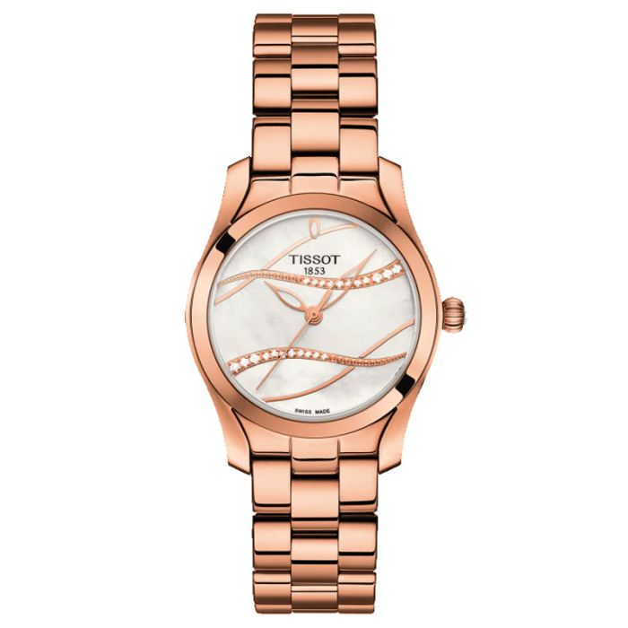 TISSOT T-Lady T-Wave T112.210.33.111.00 to niezwykle urokliwy i podkreślający kobiecość szwajcarski damski zegarek. Tarcza wykonana z delikatnej masy perłowej, nadaje temu modelowi niezwykłego połysku. Cyferblat tworzy elegancką bazę dla złotych wzorów oraz finezyjnych wskazówek, które w odpowiedzi na światło migoczą, nadając temu modelowi pewnego rodzaju magii.