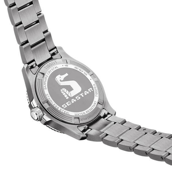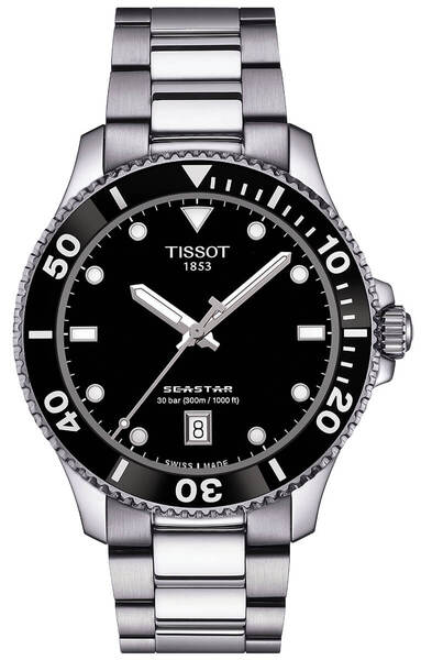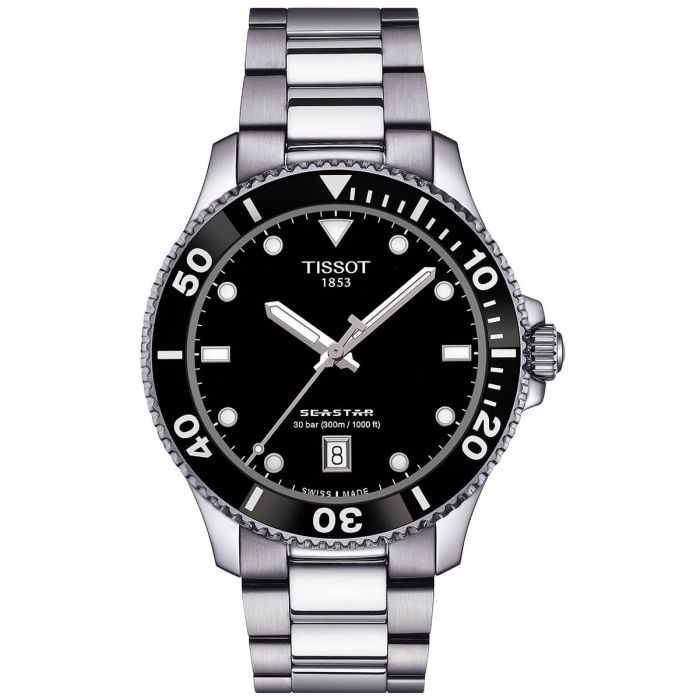 TISSOT SEASTAR 1000 T120.410.11.051.00 to szwajcarski męski zegarek, charakteryzujący się sportowym designem. Czarny cyferblat nawiązuje do głębin morskich, co doskonale podkreśla wymowę nazwy „Seastar”. Na tarczy znajdują się białe indeksy oraz stylizowane wskazówki pokryte powłoką SuperLuminovą, która ułatwia odczytanie czasu, nawet pod wodą. Dodatkowo zegarek wyposażony jest w datownik dnia miesiąca znajdujący się na godzinie 6, co ułatwia śledzenie daty oraz jest szczególnie przydatne w codziennym użytkowaniu.