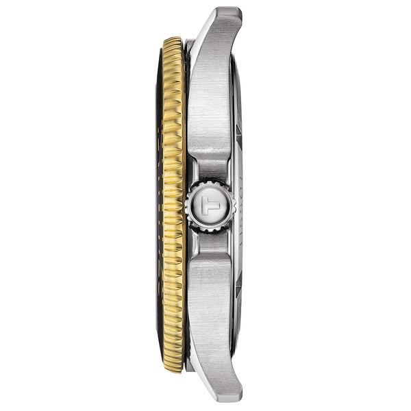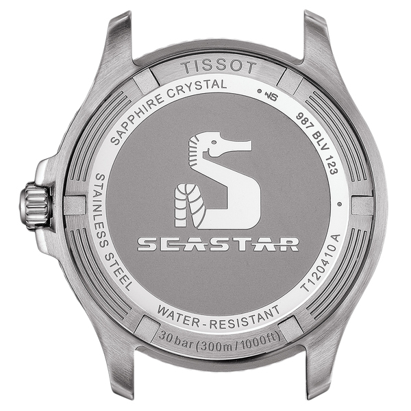 Zegarek sportowy TISSOT Seastar 1000 T120.410.27.051.00 oferuje wodoszczelność na poziomie 300 metrów (30 ATM). Posiada on jednokierunkowy bezel z ceramicznym wstawieniem, co sprawia, że jest niezawodny podczas pomiaru czasu w wodzie. Czasomierz przystosowany jest do pływania, nurkowania oraz innych aktywności wodnych.
