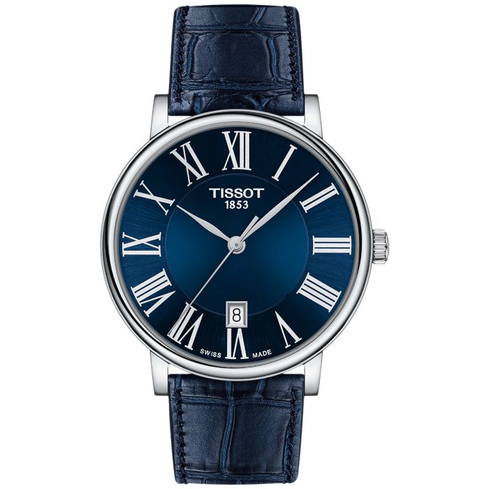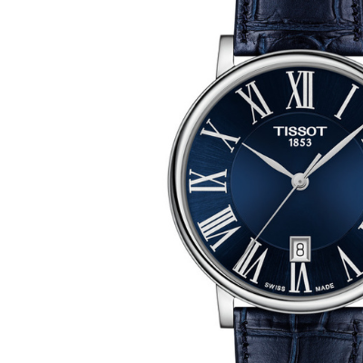 Niebieski skórzany pasek ze skóry bydlęcej został opatrzony tłoczeniem we wzorze skóry aligatora. Ten szykowny element stanowi dopełnienie kompozycji zegarka, jednak dba również o komfort właściciela. Naturalna skóra sprawia, że noszenie zegarka jest przyjemnością, a tradycyjne zapięcie ze sprzączką można łatwo regulować. W kolekcji Tissot Carson dostępne są także modele ze skórzanymi paskami dekorowanymi fakturą skóry aligatora.