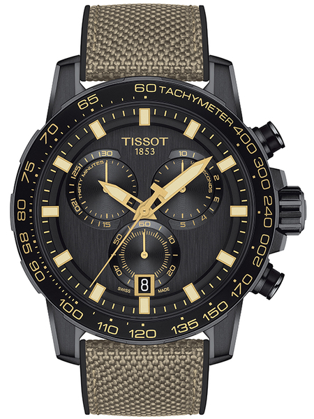 TISSOT SUPERSPORT CHRONO T125.617.37.051.01 to szwajcarski męski zegarek, charakteryzujący się sportowym designem. Na tarczy znajdują się złote indeksy oraz stylizowane wskazówki pokryte powłoką SuperLuminovą, która ułatwia odczytanie czasu, nawet pod wodą. Centralny element cyferblatu tworzą trzy subtarcze, które dodają funkcjonalności oraz złożoności kompozycji. Dodatkowo zegarek wyposażony jest w datownik dnia miesiąca znajdujący się na godzinie 6, co ułatwia śledzenie daty oraz jest szczególnie przydatne w codziennym użytkowaniu.