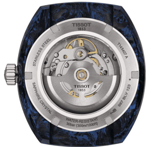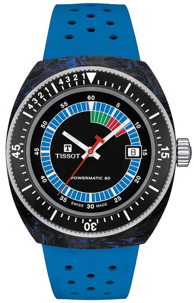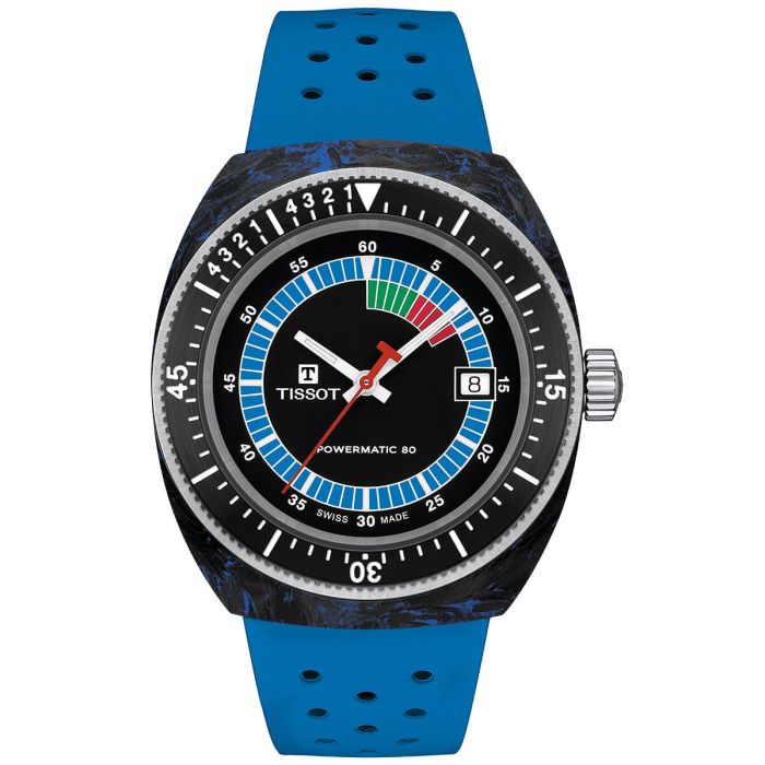 Koperta o średnicy 41 milimetrów wykonana jest z kutego włókna węglowego, co nadaje mu wyjątkową trwałość i lekkość. Zegarek Tissot Sideral jest wodoszczelny do 30 barów (300 metrów), co oznacza, że można go bezpiecznie nosić podczas pływania i innych aktywności wodnych. Wyposażony w szkło szafirowe z powłoką antyrefleksyjną, chroni przed zarysowaniami, utrzymując zegarek w doskonałym stanie przez długie lata. Efektowny niebieski pasek dodaje zegarkowi jeszcze większego uroku i sprawia, że wyróżnia się z tłumu. Spód paska jest wykonany z syntetycznego materiału, zapewniając wygodne dopasowanie do nadgarstka. Zapięcie jest wymienne, co pozwala na łatwą wymianę bransolety.