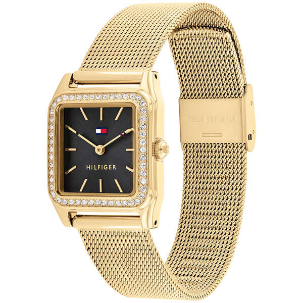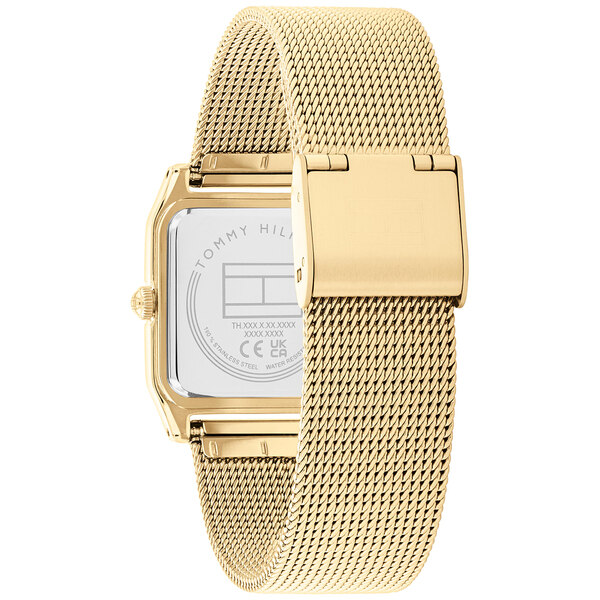 Zegarek Tommy Hilfiger 1782611 ma kwadratową kopertę o wymiarach 26 x 26 mm i grubości 8 mm. Koperta jest wykonana ze stali nierdzewnej w kolorze złotym, która jest trwała i odporna na korozję. Koperta jest ozdobiona cyrkoniami, które nadają jej blasku i biżuteryjnego charakteru. Zegarek Tommy Hilfiger 1782611 ma klasę wodoszczelności 30 m, co oznacza, że jest odporny na drobne zachlapania. Zegarek Tommy Hilfiger 1782611 ma bransoletę typu mesh, czyli siateczkową, która jest również wykonana ze stali nierdzewnej w kolorze złotym. Bransoleta jest cienka i delikatna, co sprawia, że zegarek jest lekki i wygodny w noszeniu. Bransoleta ma zapięcie typu G-Link, które umożliwia samodzielną regulację obwodu. Maksymalny obwód zegarka wynosi 17 cm, a szerokość bransolety przy kopercie to 17 mm.