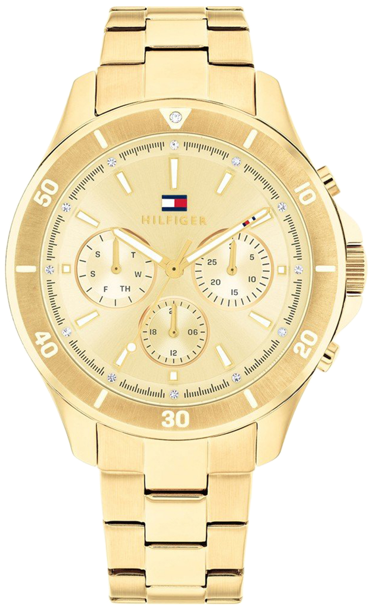 Tarcza zegarka TOMMY HILFIGER Aspen 1782640 ma kolor złoty i jest ozdobiona logo marki. Na tarczy znajdują się trzy wskazówki: godzinowa, minutowa i sekundowa, a także trzy sub-tarcze: datownik, wskaźnik dnia tygodnia i wskaźnik 24-godzinny. Tarcza jest chroniona przez szkło mineralne, które jest odporne na zarysowania i uszkodzenia mechaniczne. Szkło ma kształt okrągły i jest lekko wypukłe, co nadaje zegarkowi głębi i elegancji.