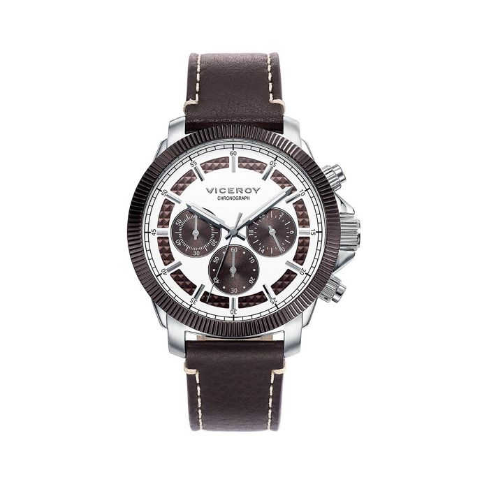 Modny zegarek męski VICEROY Magnum 471061-47 o sportowym charakterze prosto z Hiszpanii! Koperta o średnicy 43 mm została wykonana z wysokiej jakości stali szlachetnej, która nie rdzewieje. Elementem wyróżniającym się jest ciekawie wykończony pierścień dookoła tarczy. Brązowa powłoka, wykonana w technologii PVD, jest wysoce odporna na ścieranie. Zegarek został zawieszony na brązowym pasku z naturalnej skóry, która wygodnie układa się na nadgarstku. Jasne przeszycia dodatkowo przyciągają uwage. Ciekawy cyferblat z funkcją chronografu został przykryty przez wytrzymałe szkło mineralne o wzmożonej odporności na pęknięcia. Dokładne wskazanie czasu zapewnia mechanizm kwarcowy zasilany baterią. Funkcja chronografu odmierza czas do 60 minut. Wodoszczelność klasy 100M pozwala na swobodny kontakt z wodą np. pływanie.