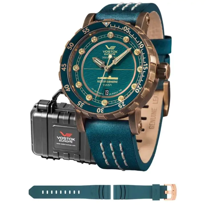 Zegarek męski na skórzanym pasku VOSTOK NH35A/571O609 zachwyca swoim unikatowym designem połączonym z jasną, niemal neonową kolorystyką. Powstał w celu upamiętnienia stworzenia i oddania do czynnej służby USS Nautilus – pierwszego okrętu wyposażonego w napęd atomowy.