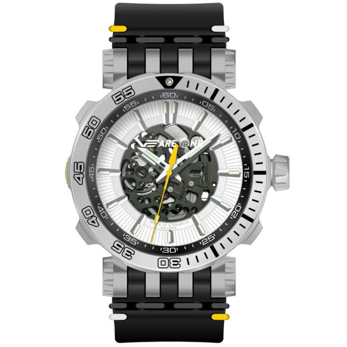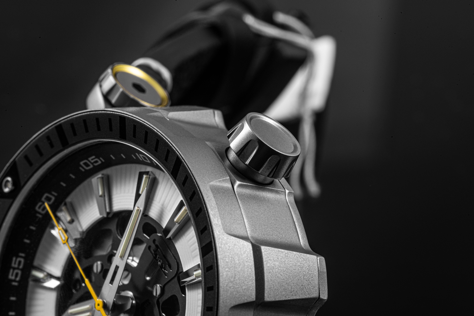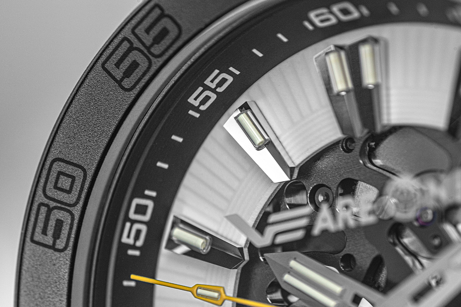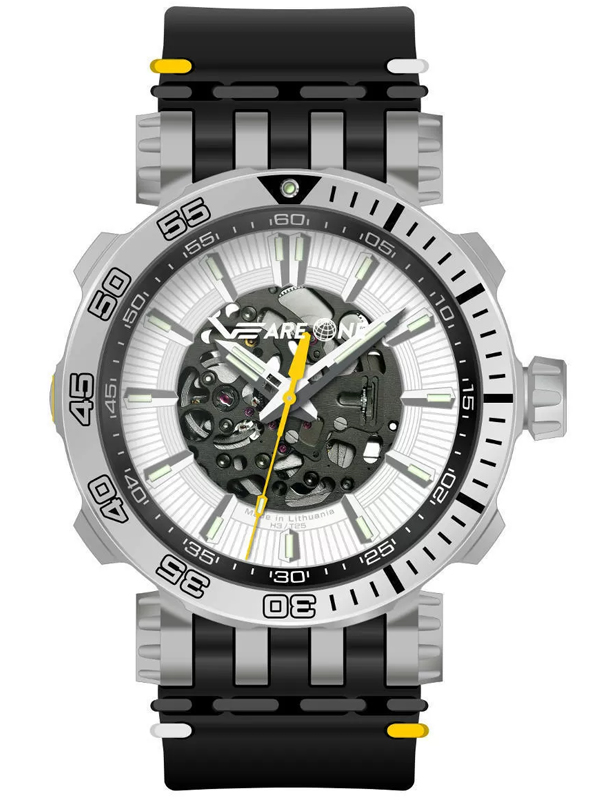 Tarcza tego nurkowego zegarka męskiego ma białą barwę, która idealnie komponuje się zarówno z czarnym, jak i białym paskiem. Znajdują się na niej srebrne indeksy w formie grubych kresek. Stylizowane wskazówki utrzymane w srebrnym i żółtym kolorze dopełniają całości. Najważniejszym detalem tego taktycznego zegarka jest centrum traczy typu open heart. Dzięki takiemu rozwiązaniu możesz obserwować pracę automatycznego mechanizmu w każdej chwilii. Nad tarczą umieszczono szkło mineralne utwardzane K1, odznaczające się wysoką odpornością na pęknięcia. Jego twardość to 7 pkt w skali Mohsa. Ponadto pokryte jest antyrefleksyjną powłoką minimalizującą odbicie promieni świetlnych, co ułatwi odczyt godziny w każdych warunkach.