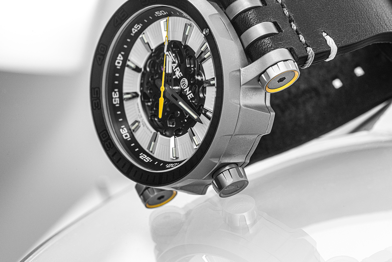 Szara koperta tego automatycznego zegarka męskiego z kolekcji Energia została wykonana z tytanu, dzięki czemu jest odporna na negatywne działanie czynników zewnętrznych. Umieszczono na niej obrotowy bezel z naniesioną skalą, który sprawdzi się do odmierzania spędzonego pod wodą czasu. Posiada także zakręcany dekiel oraz koronkę, które zwiększają wodoszczelność czasomierza. Została umocowana na czarnym, zapinanym na sprzączkę pasku. Do jego wyprodukowania wykorzystano skórę naturalną, odznaczającą się dużą odpornością na pęknięcia. Skóra dopasowuje się także do kształtu nadgarstka, co zwiększa komfort użytkowania. Dodatkowo do zestawu załączono dodatkowy, biały silikonowy pasek oraz narzędzie służące do jego wymiany.