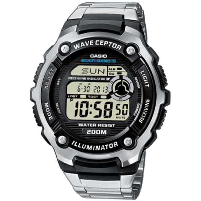 Sportowy zegarek z cyfrowym wyświetlaczem - CASIO Radio Controlled WV-200RD-1AEF. Ten model został wyposażony w wyjątkową funkcję automatycznej synchronizacji czasu drogą radiową z 5 stacjami nadawczymi w Europie, Japonii oraz Stanach Zjednoczonych. Koperta w kolorze czarnym została zawieszona na srebrnej stalowej bransolecie. Elementy te wykonano z wysokiej jakości tworzywa sztucznego. Cyfrowy wyświetlacz posiada funkcję podświetlenia, które umożliwia odczytanie czasu w ciemności. Zegarek ponadto wyróżnia się funkcjami czasu światowego, 60 minutowego stopera i timera oraz alarmu dziennego. Automatyczny kalendarz pamięta krótsze miesiące i lata przestępne. Wodoszczelność klasy 200M pozwala na swobodny kontakt z wodą, a nawet nurkowanie.