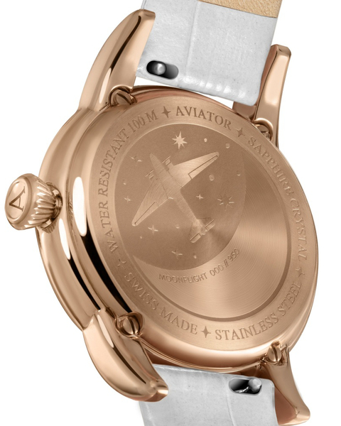 Złotą kopertę damskiego zegarka Aviator Douglas Moonflight V.1.33.2.251.4 odlano ze stali szlachetnej 316L - materiału odpornego na uszkodzenia mechaniczne i efekty korozji. U boku obudowy, na wysokości godziny 3, mieści się solidna koronka, również o barwie złota.