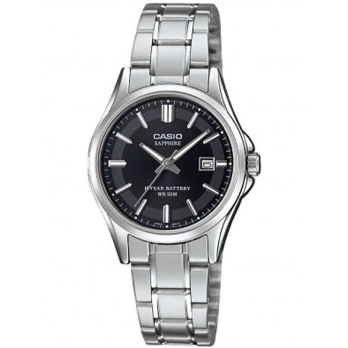 Tarcza w tym zegarku damskim Casio przykryta jest szkłem szafirowym o wysokiej odporności na uszkodzenia mechaniczne.