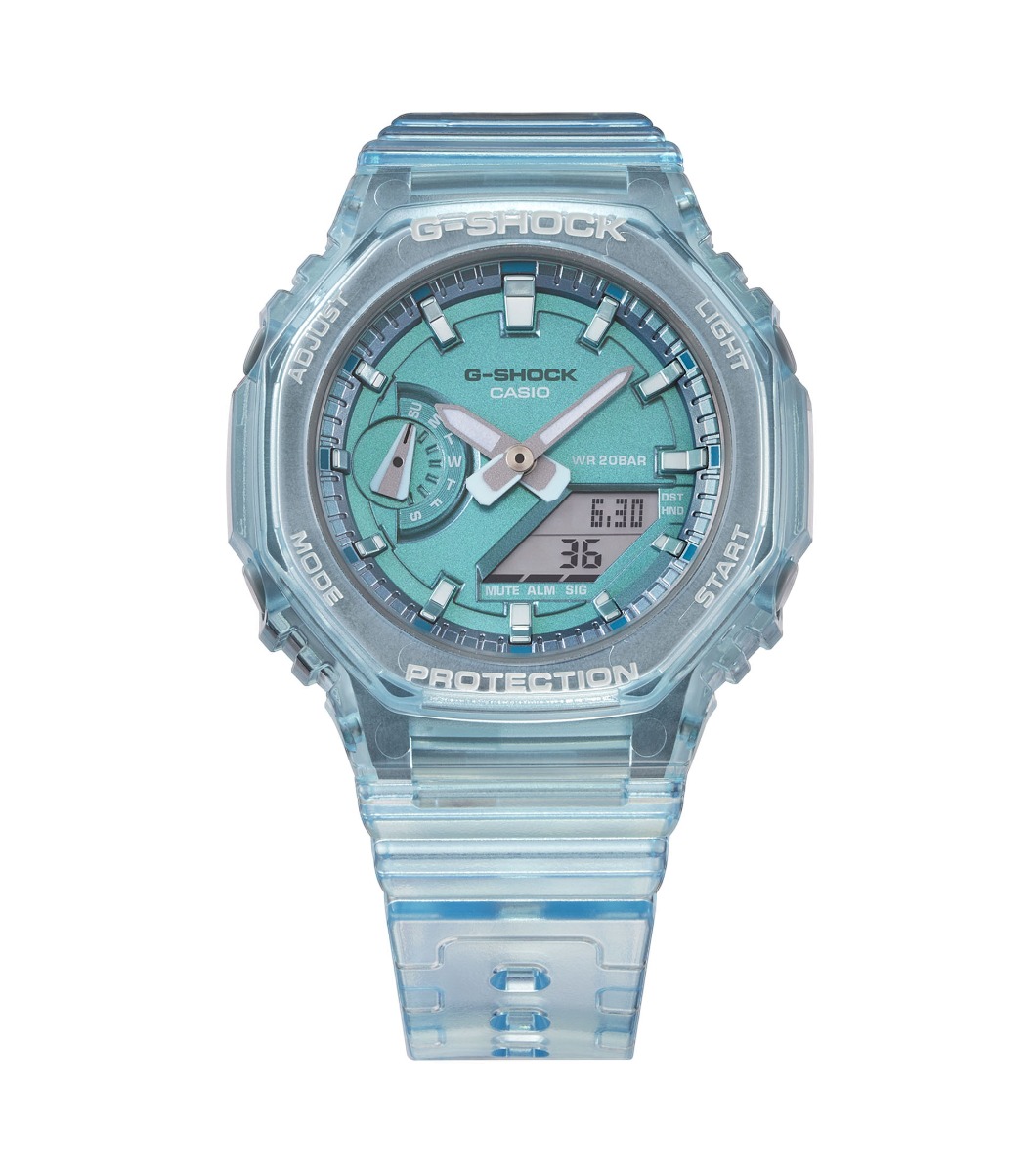 G-SHOCK Women GMA-S2100SK-2AER to nowa propozycja od japońskiego producenta zegarków, które znane są ze swojej niezwykłej wytrzymałości. Zegarek G-SHOCK damski GMA-S2100SK-2AER to idealne połączenie sportowego stylu z modą i kobiecością. Transparentny pasek i koperta pomogą Ci stworzyć wiele modnych stylizacji i wyróżnić się z tłumu. Koperta tego zegarka damskiego jest niezwykle cienka (11 mm), dzięki czemu jest zgrabna i lekka. Pastelowy, niebieski kolor sprawia, że wygląda energicznie i subtelnie zarazem. Model ten posiada znany na całym świecie system wstrząsoodporny od marki G-SHOCK.