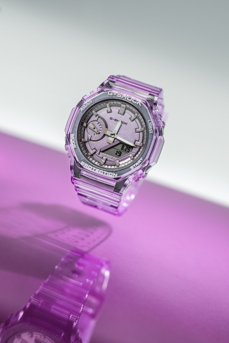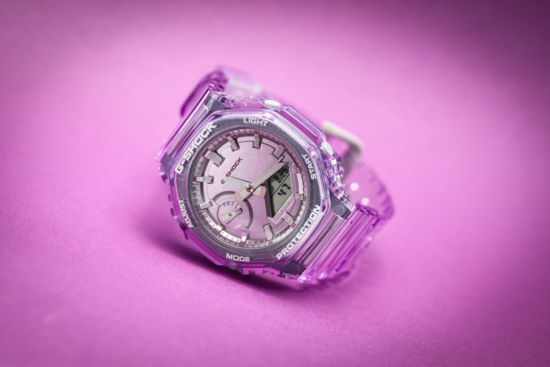 Różowa koperta zegarka została wykonana z żywicy wzmocnionej włóknem węglowym (carbon). Koperta tego zegarka damskiego jest niezwykle cienka (11 mm), dzięki czemu jest zgrabna i lekka. Transparentny pasek i koperta pomogą Ci stworzyć wiele modnych stylizacji i wyróżnić się z tłumu. Pasek z tworzywa sztucznego o standardowym zapięciu doskonale dopasuje się do nadgarstka oraz sprawdzi się świetnie podczas uprawiania sportu. Różowa tarcza zegarka G-SHOCK GMA-S2100SK-4AER posiada cyfrowo-analogowy odczyt czasu. Będzie czytelna również nocą, ze względu na podświetlenie diodą LED oraz pokryciem wskazówek i indeksów powłoką Neobrite. Tarcza damskiego zegarka G-SHOCK GMA-S2100SK-4AER pokryta jest niezwykle odpornym na stłuczenia szkłem mineralnym. To nie tylko zegarek do uprawiania sportu - design zegarka dopełni każdy outfit. Wiele wariantów kolorystycznych serii GMA-S2100 pozwala Ci wyrazić siebie za sprawą zegarka G-SHOCK.