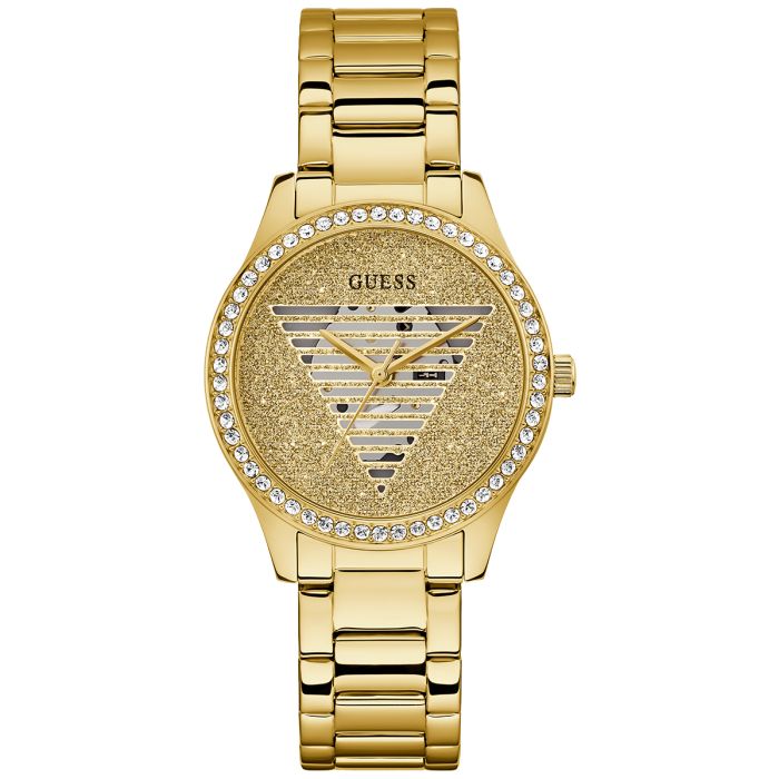 Tarcza tego zegarka to prawdziwe dzieło sztuki, które w połączeniu z kopertą w złotym kolorze tworzy efektowną kompozycję. Kolor szampańskiego złota tarczy, zdobionej migoczącymi kryształkami, przyciąga spojrzenia i dodaje blasku całemu nadgarstkowi. Ciekawym detalem jest logo marki Guess wycięte na tarczy, przywodzi na myśl wyjątkowy charakter marki. Szkło mineralne przykrywające tarczę cechuje się wysoką odpornością na stłuczenia.