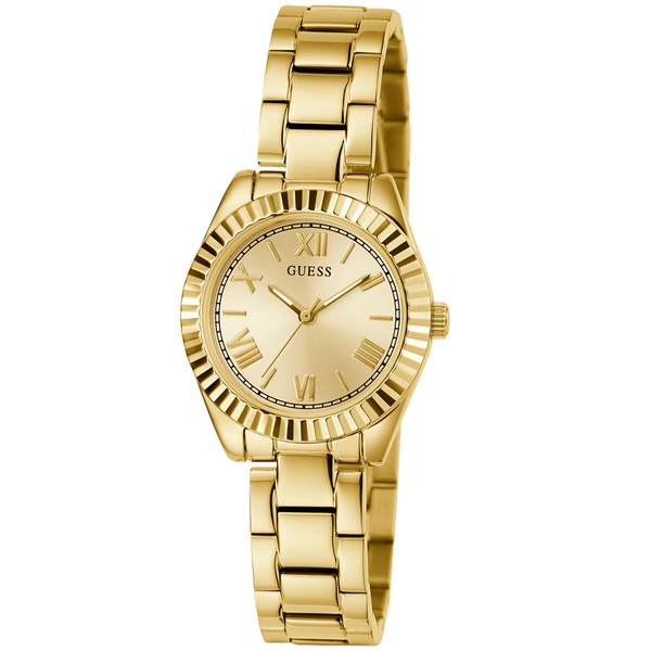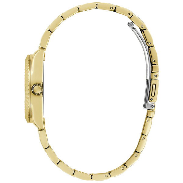 Koperta zegarka Guess GW0687L2 wykonana jest z trwałej stali szlachetnej i ma elegancki, złoty kolor. Jej okrągły kształt i szerokość 30 mm sprawiają, że zegarek wygląda delikatnie i kobieco na nadgarstku. Wodoszczelność na poziomie 30 m (3 bar) zapewnia ochronę przed przypadkowymi zachlapaniami, co jest niezwykle praktyczne w codziennym użytkowaniu. Złota bransoleta, również wykonana ze stali nierdzewnej, jest wyposażona w standardowe zapięcie zatrzaskowe z zabezpieczeniem, co zapewnia komfort i bezpieczeństwo noszenia. Możliwość regulacji obwodu bransolety pozwala na idealne dopasowanie do nadgarstka.