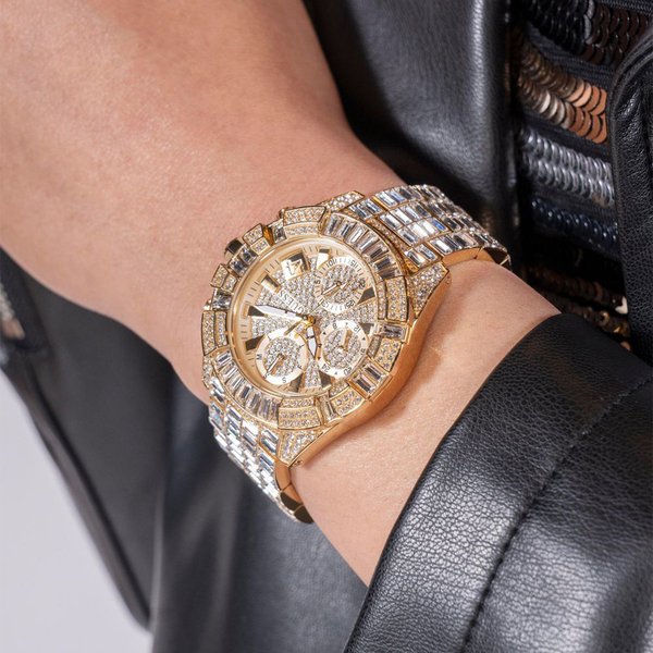 Tarcza zegarka GUESS GW0812L2 jest utrzymana w eleganckiej, złotej kolorystyce, która idealnie komponuje się z resztą modelu. Złoty odcień nadaje mu biżuteryjnego wyglądu, sprawiając, że doskonale sprawdzi się w roli wyjątkowego dodatku do stylizacji. Czas odczytywany jest za pomocą analogowych wskazówek, co podkreśla klasyczny styl zegarka. Tarczę chroni mineralne szkło, które jest wytrzymałe i odporne na zarysowania, gwarantując długotrwałą przejrzystość i ochronę przed uszkodzeniami.