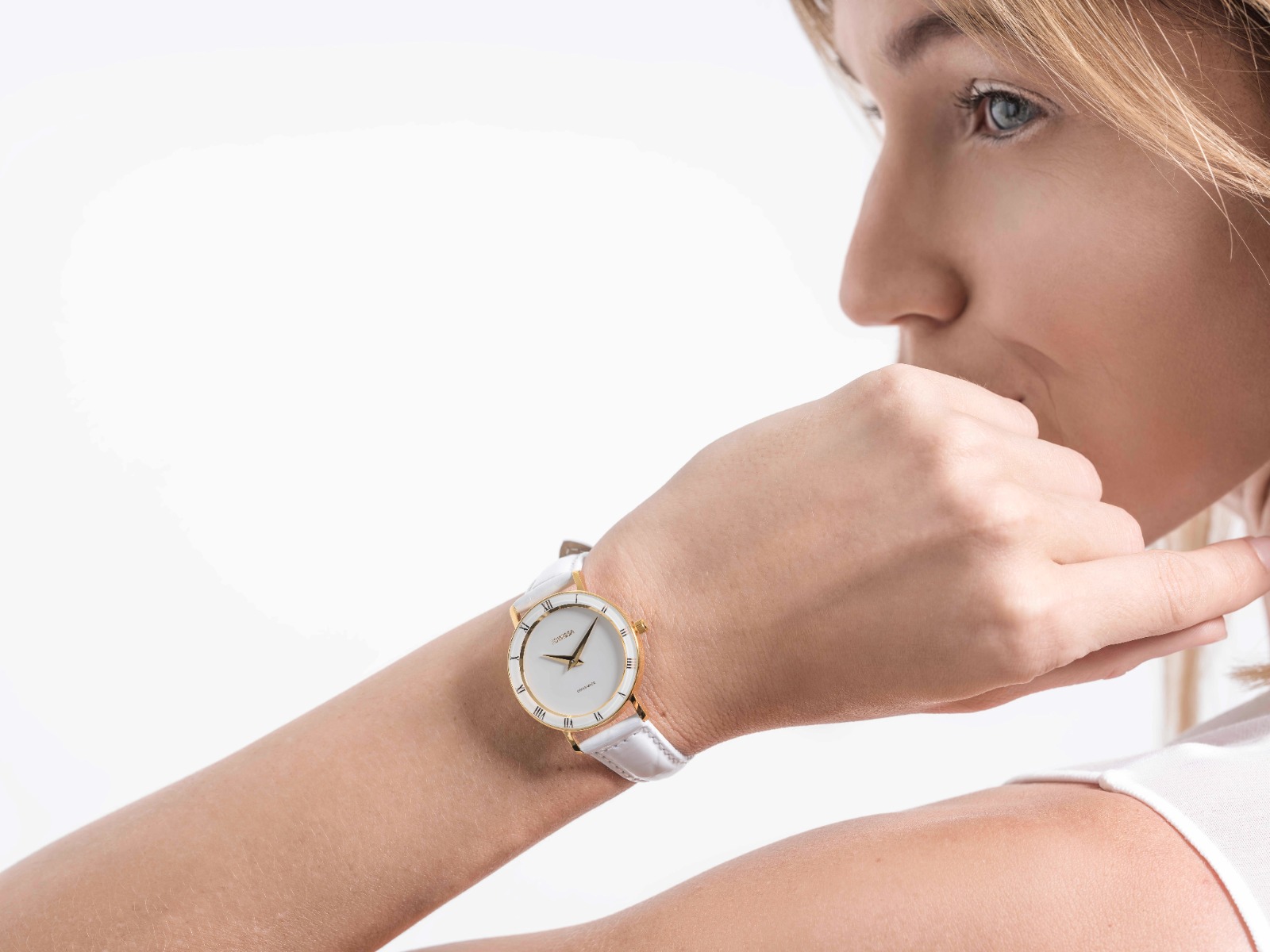 Koperta zegarka wykonana jest z wysokiej jakości stali nierdzewnej, pokrytej złotem, co nadaje jej luksusowego charakteru. Jej wysokość wynosi zaledwie 6 mm, co sprawia, że jest niezwykle smukła i wygodna w noszeniu. Zegarek posiada błyszczący, biały pasek ze skóry naturalnej z tłoczeniem aligatora, który doskonale komponuje się z całością. Szerokość paska to 15 mm, a zakres regulacji wynosi od 140 do 190 mm, co pozwala na idealne dopasowanie do nadgarstka.