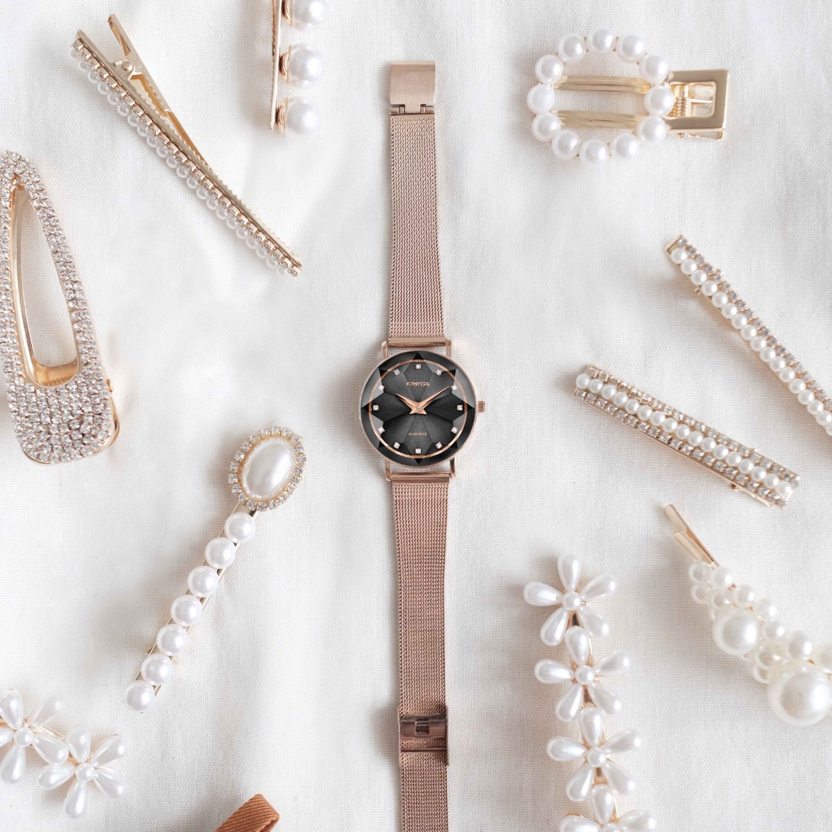 Koperta o średnicy 30,5 mm wykonana jest z wysokiej jakości stali nierdzewnej, co zapewnia trwałość i odporność na uszkodzenia. Została ona wykończona w kolorze różowego złota, co tworzy luksusowy kontrast z czarną tarczą. Bransoleta mesh z różowozłotej stali nierdzewnej jest ciągle regulowana, co umożliwia idealne dopasowanie do nadgarstka o obwodzie od 150 do 195 mm. Zapięcie z logo Jowissa dodaje prestiżu i pewności noszenia.