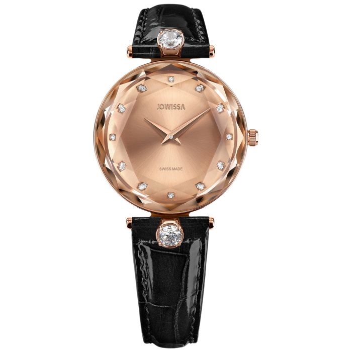 Tarcza zegarka wykonana w technice sunray błyszczy przy każdym ruchu, a 12 kamieni Strass pełniących funkcję indeksów godzinowych dodaje blasku każdej godzinie. Wskazówki w stylu Dauphine, wykończone diamentowym szlifem, idealnie komponują się z eleganckim designem tarczy. Szkło zegarka, które zostało wycięte na wzór szlifu brylantowego, tworzy efekt wielowymiarowych refleksów świetlnych, co nadaje mu biżuteryjny charakter.